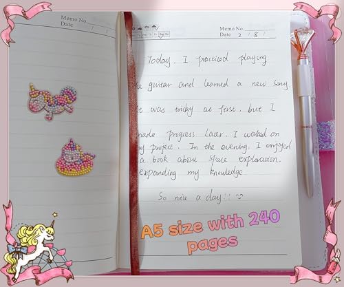 - 1.🎀THE DIARY GIFT BOX FOR GIRLS INCLUDED: 1 pink leather diary, 1 diamond shaped pen,1 dry flower bracelet, 12 DIY diamond art kits stickers, 1 greeting card. Believe no girls can refuse interesting shiny journal gift set.