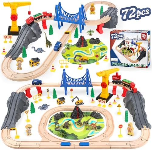 Wooden Train Set for Toddlers & Kids, 72Pcs Wooden Train Track with Crane, Expandable Toys Train Set for 3 4 5 6 7 Years Old Boys & Girls Christmas Birthday Gifts - Fits All Major Brands Railway Set