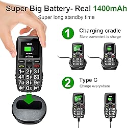 【NEW SIMPLE SETTING】Senior Phone 1.77 inch display, new operating system with larger fonts, clearer menu icons, speakers, ideal for seniors. With a charging cradle and a type-c charging cable, charger, it is very convenient for seniors to charge their mobile phones when needed. Senior mobile phones are different from ordinary smartphones. Its main function is to call, send and receive SMS. Supports 4G 3G 2G signal. The phone supports three scene modes: ring, vibration and silent. You can long press the number 0 to switch quickly. 【SOS FUNCTION WITH 5 SOS CALL NUMBERS】The C1+ senior cell phone has an SOS button on the back, which can be used to set up 5 SOS phone numbers. If you press the SOS button, the phone will automatically call these numbers until someone answers. Your phone can send messages during calls, and you can choose to disable this feature. If you press the number by mistake, you can cancel the call within 3 seconds. 【UPGRADED 1800mAh LARGE BATTERY】The large key cell phone for seniors offers a 1800mAh battery with a larger battery capacity than all similar products. 5-6 hours of continuous talk time, 168-300 hours of standby time (7-12 days), and incredible battery life. Two charging methods: base charging/Type-C direct charging, faster and safer charging. 【NEW SIDE RELEASE BUTTON & SIDE FLASHLIGHT BUTTON】Equipped with flashlight, just press the left button to turn on/off the flashlight. Senior phones support hands-free, FM radio, Bluetooth, calculator, Single SIM, key lock/unlock, audio playback, MP3, U disk and other functions. The case is equipped with a lanyard, convenient for the elderly to carry and prevent cell phone loss. Expandable storage (64GB Micro SD card), 3.5mm headphone jack. 【TIPS】The phone's default language is English, which can be changed to other language in the settings menu. The phone is a no-contract push-button phone, compatible with 4G, 3G, and 2G networks except MVNO operators. You can choose the carrier plan that best suits your needs. ① If your phone can't power on after inserting the battery, don't worry, charge it! ② If your phone can't recognize the SIM card, check if the SIM card is inserted correctly.
