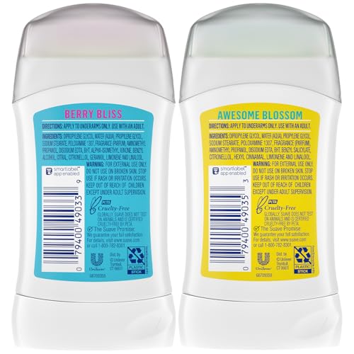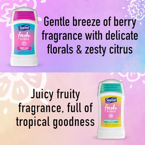 - SWEET & JUICY SCENTS: The Suave personal care bundle includes one sweet and fruity Berry Bliss and one tropical and juicy Awesome Blossom Deodorant Stick.