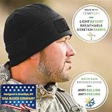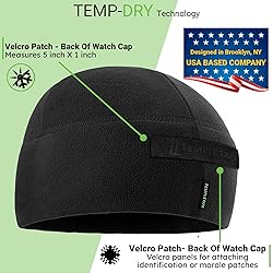 Black - Tactical Beanie Hat with US Army style Front & Back Patch Panel - One Size - Designed in the USA Temple Tape Tactical Fleece Winter Watch Cap Patch design is inspired by American military gear, bringing you from cold & annoyed to warm & stylish.The Hook and Loop Patch uses US Military sizing standards. The durable light weight thermal fitted skull cap is great for men & women. Anti Peeling - Our layered midweight micro fleece watch caps keep the heat in while wicking away moisture. The beanie is lined with 2 layers of Anti Balling super fine fleece. Temp Dry Technology wicks away your sweat and dries faster than cotton. Temple Tape Watch Caps retain their shape & do not cause headaches. These fleece police skull caps with front & back patch design are windproof & can be used in any weather. A perfect outdoor running beanie on those cold winter days. Fits under all types of helmets. These hats are perfect for Skiing, Hunting, Hiking, Hockey , Outdoor Sports, Paintball, Running, Exercise or just to keep you warm on those cold windy days - there is no limit to the uses for these fleece beanies. Durable, Lightweight, Comfortable, Warm & Super Versatile - UPF 50+ Sun Protection, makes a perfect birthday , stocking stuffer or Christmas gift.