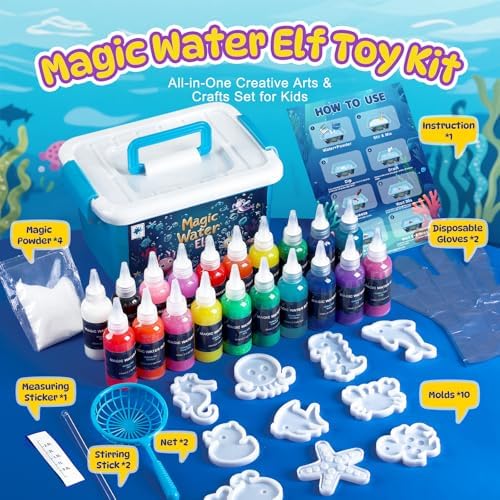 - Great Arts & Crafts for Kids:The magic water elf engages kids with 10 vibrant colors and sea creature molds, boosting color and shape recognition while reducing screen time. It improves focus, patience, and hand-eye coordination through hands-on fun. Includes portable jars for displaying aquatic pets and fostering creativity.