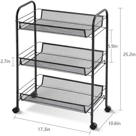 - 【Breathable Mesh Design & Space-Saving】 3-tier elevated mesh storage shelves with air-permeable mesh structure: keeps fruits and veggies fresh without getting stuffy in the kitchen, and prevents water buildup for toiletries in the bathroom. Each shelf is equipped with 2.7in elevated rails to stop items from slipping off. With 5.9-inch shelf spacing, it easily fits tall bottles (like large spice jars or shampoo bottles). Measuring 17.3"W × 25.2"H, the slim design fits very suitable into kitchen corners, bathroom gaps, or under desks—maximizing vertical space without taking up floor room