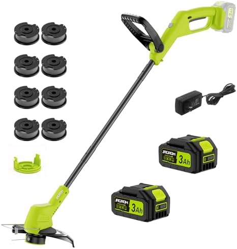 - [Upgrade Strong Motor] JAGROM upgrade cordless string trimmer equipped with a more powerful motor, which can help you solve various types of weed problems. Whether it is thick grass or messy wild grass, our machines can carry out effective cleaning. Our product has a spacer guard, it will protect your flowers when it's trimming. You will get a tidy and beautiful courtyard and garden after the machine finish working.