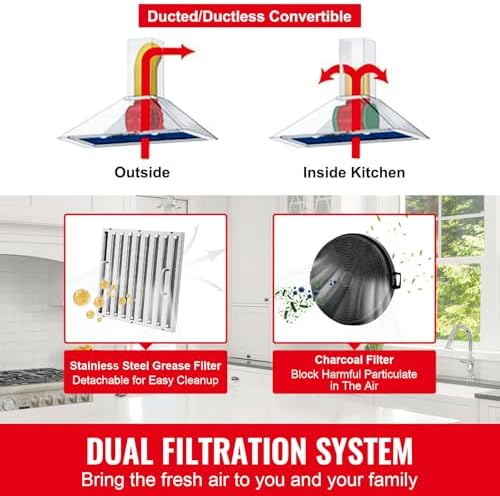 - Dual-Layer Filtration System: This range hood is equipped with double-layer filtration, consisting of three stainless steel filters that effectively trap grease and oil during cooking. These filters are dishwasher-safe, making maintenance simple and hassle-free. Additionally, the high-quality activated carbon charcoal filter ensures harmful particles and smoke are absorbed, leaving your kitchen air fresh.
