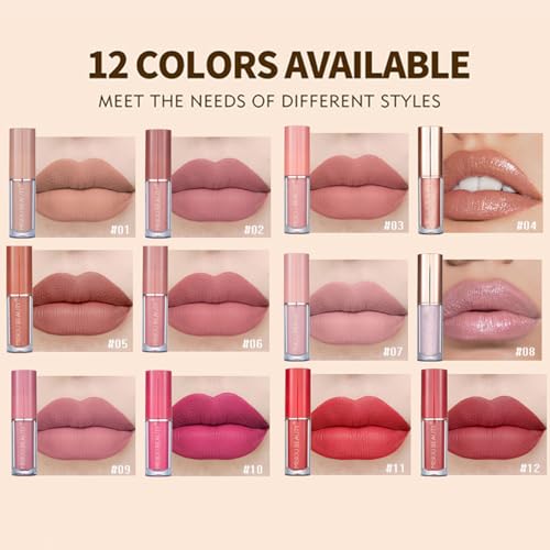 12Pcs Velvet Matte Liquid Lipstick Set, Non-Stick Cup Nude Lip Stain Kit,Waterproof Long Lasting Quick-drying Matte and Glitter Lip Gloss,Lip Makeup Gift Kit for Women