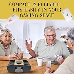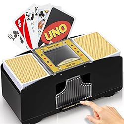 [Effortless Automatic Card Shuffling] : Tired of manual shuffling? This automatic card shuffler 2 deck ensures seamless, random, and fair shuffling with just the push of a button. Whether using it as a card shuffler 1 deck or 2 deck card shuffler, it’s designed for smooth operation. Perfect for poker, blackjack, Uno, bridge, and rummy, this battery-operated card shuffler and dealer eliminates uneven mixes, prevents card stacking, and enhances every game. [Battery-Powered & Portable] : Designed for convenience and portability, this 2 deck automatic card shuffler runs on 4 AA batteries (not included), making it ideal for home games, casino nights, camping trips, and travel. Whether you need a card shuffler 1 deck or a 2-deck system, this shuffler provides wireless flexibility. No tangled cords—just load your poker cards, Uno shuffler card machine, or standard playing cards, press the button, and shuffle effortlessly. [Compatible with Most Card Games] : This electric card shuffler works with poker accessories, Uno, blackjack, Rummy, Canasta, Pinochle, and other trading card games (TCG). Whether you're enjoying a casual game night or a high-stakes tournament, this card shuffler and dealer ensures even card mixing. Perfect for seniors who struggle with manual shuffling, professionals, or families who want to make game night faster and smoother. [Quiet, Durable & Casino-Grade Performance] : Unlike bulky, noisy models, this quiet card shuffler operates silently and smoothly. Made from high-quality ABS plastic, this battery-operated playing card shuffler is built to last through countless game nights. Whether using it as a card shuffler 1 deck for a quick game or a 2-deck shuffler for a casino-style experience, this casino-grade poker card shuffler guarantees fast, silent, and professional shuffling every time. [Perfect Gift for Card Players] : Looking for a unique and practical gift? This automatic poker card shuffler and dealer is the perfect choice for poker lovers, casino enthusiasts, seniors, and card game fans. Great for holidays, birthdays, and special occasions, this uno shuffler card machine makes games fair, fun, and hassle-free. Whether for poker tables, family game nights, or professional tournaments, it's a must-have poker accessory that every card player will love!