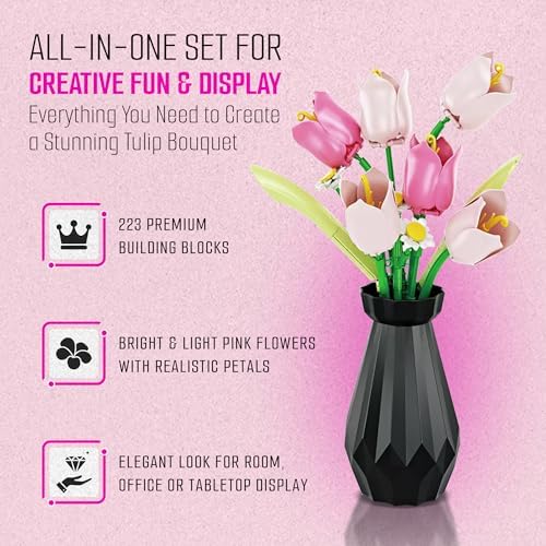 Flower Building Set Compatible with Lego Flowers for Adults, Tulip Flower Bouquet botanicals Collection Unique Home Décor or Office Décor Great Gift for Her and Him (VASE Included) (Flowers Tulip)
