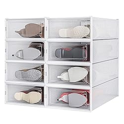 【Durable Material】Made from-quality PP material, the shoe box features a combination of soft body and hard front and back frames, ensuring long-lasting durability and reliable protection for your shoes 【Stackable & Space-Saving】 The shoe boxes can be easily stacked, and the unique top groove ensures they stay securely in place, saving space and keeping your area neat and tidy 【Convenient Front Door】Equipped with a front door, allowing you to access your shoes without having to move other boxes, making it incredibly convenient to use 【Quick Identification】The transparent box lets you quickly spot and select the shoes or items you're looking for, helping to save time. It's also easy to clean and reuse 【Multiurpose Use】Besides storing shoes, this versatile shoe box can also be used to store cosmetics, toys, clothes, books and more, catering to various storage needs