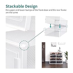 【Durable Material】Made from-quality PP material, the shoe box features a combination of soft body and hard front and back frames, ensuring long-lasting durability and reliable protection for your shoes 【Stackable & Space-Saving】 The shoe boxes can be easily stacked, and the unique top groove ensures they stay securely in place, saving space and keeping your area neat and tidy 【Convenient Front Door】Equipped with a front door, allowing you to access your shoes without having to move other boxes, making it incredibly convenient to use 【Quick Identification】The transparent box lets you quickly spot and select the shoes or items you're looking for, helping to save time. It's also easy to clean and reuse 【Multiurpose Use】Besides storing shoes, this versatile shoe box can also be used to store cosmetics, toys, clothes, books and more, catering to various storage needs