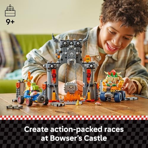- ESCAPE FROM BOWSER'S CASTLE – Young gaming fans ages 9 years old and up can build an iconic Mario Kart track with the LEGO Super Mario: Mario Kart – Bowser's Castle (72039) building set featuring foldout walls, a spinning Fire Bar, and a plunging Thwomp