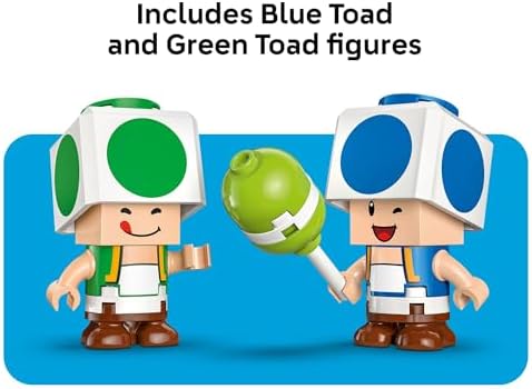 - 2 SUPER MARIO TOY FIGURES – This party-packed building toy includes Blue Toad and Green Toad figures, removable furniture, and all of the accessories needed for an awesome pretend play party