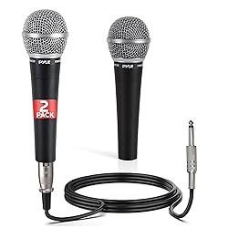 - Elevate your audio setup with the Pyle Professional Dynamic Microphone 2-Pack, delivering exceptional sound clarity and versatility. Perfect for live performances or studio recordings, each microphone features a built-in acoustic pop filter to minimize distortion and enhance vocal quality. Whether singing, presenting, or recording, this set ensures professional-grade audio every time. Optimized for karaoke enthusiasts, this karaoke microphone set offers unidirectional sound capture that isolates vocals while reducing background noise. Crafted with rugged zinc alloy bodies and steel mesh grills, these dynamic microphones are built to endure regular use while maintaining top-notch performance. Each wired microphone comes with a 15-foot XLR to 1/4'' audio cable, providing flexibility and convenience for a seamless setup. Perfect for duets, multi-performer setups, or ensuring you always have a reliable backup, this 2-pack delivers dependable, high-quality audio performance. Designed for performers and professionals alike, this handheld microphone set is ideal for stage performances, studio recordings, and karaoke nights, offering the durability and sound quality you can count on.