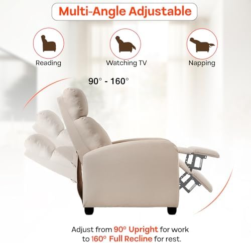 - 👍【Push Back Adjustable Recliner and Ultimate Relaxation】This recliner chair uses a push-back adjustment method, and you can sit and push back in your way. Multiple relaxation modes in this reclining chair can support your body fully, it features 90 to 160 degree adjustment upholstered recliner chair backrest and lifting footrest to provide an ultimate relaxation mood and sensuality. Recliner sofa Single recliner chair Home theatre chair club chair