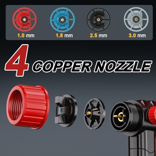 - Versatile Nozzle Options: 4 corrosion-resistant copper nozzles handle different spray needs, from fine detailing to broad coverage, ensuring professional results.