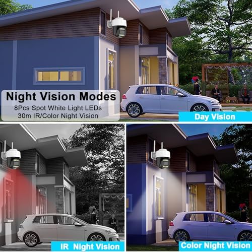 - 2K HD Color Night Vision WiFi Camera: This WiFi outdoor security camera provide 2304*1296P full HD clearer images and video at day and night. Equipped with white lamp and infrared lamp, automatically switch day/night mode through IR-cut, and maintain real-time and accurate intelligent motion alarm in black-and-white mode, even in the dark, the best night vision distance up to 98ft
