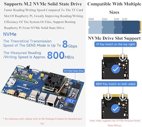 - Supports M.2 NVMe Solid State Drive, Faster reading/writing speed compared to the TF card slot of Compute Module 5, greatly improving reading/writing efficiency of the system or files, support booting Compute Module 5 from NVMe Solid State Drive, Compatible with 2280 2260 2242 2230 SSD