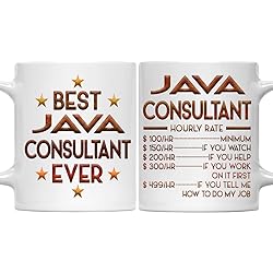 - Best Java Consultant Ever 11oz White Ceramic Mug: Monizilucky creates unique funny coffee mugs which make great Birthday gift ideas for men, Birthday gift ideas for women, Valentine’s Day gift ideas, Mother’s Day gift ideas for Mom from Daughter or Son, Father’s Day gift ideas for Dad, Anniversary gift and Christmas present ideas for him or her. This funny coffee mug is made out of high quality ceramic. If you're shopping for a gift, you've found the one. Have a great gift delivered to their door, on-time in a nice gift box. This is the perfect mug for you or for someone you want to bring a smile to. A perfect size mug you can drink tea, soup or coffee out of. ● Printed in the USA ● Worldwide shipping ● Print type: Sublimation printing ● Material: Ceramic ● Color: White ● Sizing: 11oz ● Printed on both sides.