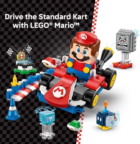 - INTERACTIVE RACING PLAY - Young builders can use the interactive LEGO Mario figure to earn digital rewards from the Item Box, defeat the Bob-omb and Thwomp figures, and trigger Mario Kart sound and visual effects by placing him in the Standard Kart