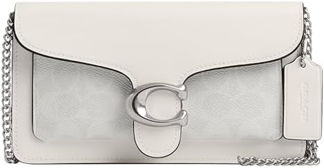 A modern take on an archival 1970s Coach design, our structured Tabby clutch is finished with our Signature hardware and crafted of our Signature canvas. Signature coated canvas and refined calf leather, eight credit card slots, inside zip and open pockets, snap closure, fabric lining, outside open pocket, detachable chain strap with 21 1/2" drop for shoulder or crossbody wear, 8 1/4" (L) x 4 1/2" (H) x 2" (W)