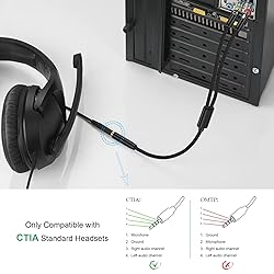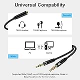- Headphone Mic Splitter Cable: 1x 3.5mm TRRS Female to 2x 3.5mm TRS Male BEST FEATURES 1. 24K Gold-Plated Connectors: Ensure reliable performance and minimal signal loss. 2. Input: 3.5MM 4-Position Female connector for headsets, headphones, or earphones. 3. Output 1: 3.5MM 3-Position Male connector for the headphone jack on your PC or laptop. 4. Output 2: 3.5MM 3-Position Male connector for the microphone jack on your PC or laptop. 5. Oxygen-Free Copper Construction: Provides maximum conductivity and durability. 6. Flexible Cable Length: Measures at a convenient length of 10 Inch / 26CM. 7. Eco-Friendly Materials Used (Pure Copper Oil): Minimizes signal interference. Usage Connect a TRRS headset (4-position) to a PC or computer that features separate microphone and headphone jacks. HIFI Sound Quality The 3.5mm audio splitter utilizes oxygen-free copper wires with triple shielding to protect against interference, minimize signal loss, and reduce noise. Plug and Play Functionality This audio splitter allows you to connect one headset (supporting both audio and microphone) into two separate jacks—one for headphones and one for the microphone. Durable and Flexible Construction The mic splitter adapter is crafted from durable materials with nylon braiding, significantly enhancing flexibility and longevity. Compatibility: Compatible with Astro A10 A40, Turtle Beach, BENGOO, HyperX Cloud, SteelSeries, Razer Kraken Compatible with Sennheiser, Sades to PC with separate microphone and audio connectors Compatible with PlayStation 4 PS4, One, Switch or Smartphone headsets with a single 3.5mm TRRS 4Pole jack Works with All PC Applications - Skype, MSN Messenger, Yahoo, Google Voice and Many More. Package: 1 Pack 3.5mm Female to 2 Dual 3.5mm Male Headphone Mic Audio Y Splitter Cable