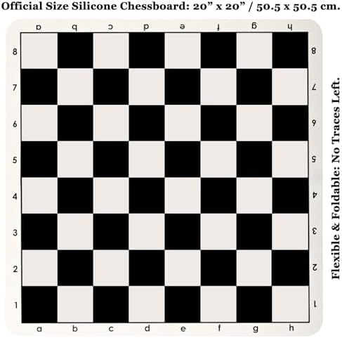 - Chess Set Components: Silicone chess board, standard tournament size, 20inch x 20inch / 50.5cm x 50.5cm chess board with 2.25inch squares; 34 chess pieces including 2 extra queens,classic king height 3.5inch; 2 velvet bags; Zippered bag.