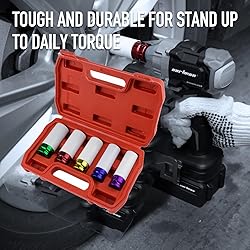 - This professional-grade 1/2-inch deep impact socket set comes with 5 color-coded sockets housed in a durable red carrying case. The set features precision-engineered sockets with distinctive metallic finishes in purple, blue, gold, red, and green for quick identification. Each socket is constructed from hardened steel for maximum durability and long-lasting performance. The deep-well design allows access to hard-to-reach fasteners and accommodates longer bolts. The sturdy storage case includes custom-molded compartments to keep your sockets organized and protected. Perfect for automotive work, machinery maintenance, and heavy-duty applications, these impact sockets are designed to withstand high torque loads when used with impact wrenches. The convenient carrying handle makes transportation easy, while the secure latching system ensures your tools stay in place during transport.