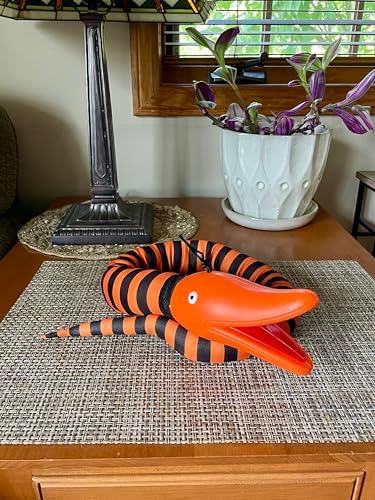 This snake hanging decoration measures 3 feet long (36") and hangs from a loop attached to the top of the head. Features bendable fabric body. A perfect Halloween decoration for any scene, display or party. Goes great with Jack, Sally, Zero, Pumpkin King, and Oogie hanging characters!