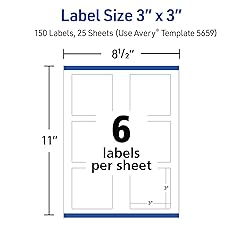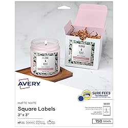 - Whether for business or personal use, this pack of 150 Avery 5659 Matte White Square Labels provides the flexibility to design and print exactly what you need. The classic white surface of these 3" x 3" labels provides the perfect blank canvas for colorful graphics and messaging to stand out, giving your product or project a polished, professional finish. Avery labels are carefully constructed with patented features to provide the best results. Sure Feed technology reduces jams or smudges by creating a more reliable feed through your printer. The print-to-the-edge layout allows for beautiful full-bleed designs that print all the way to the edge of the label. Easy Peel with Pop-Up Edge lets you fold the sheet back to pop up the label edges for faster peeling. Get crisp, smudge-free printing from your laser or inkjet printer, or handwrite directly on labels for one-of-a-kind creations. You can easily customize your labels using Avery Design & Print Online, which offers thousands of Avery templates and helpful design tools, then print your custom labels on demand. Create beautiful, customized sticker labels that go above and beyond identification, including custom product labels, candle labels, thank you labels, bath & beauty labels, and more.