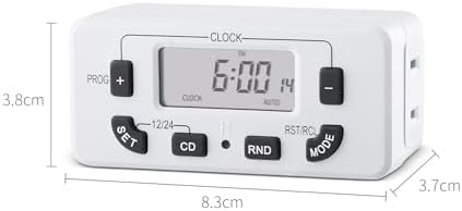 - USEFUL ANDFRIENDLY DESIGN: The timer system can be set to 12-hour mode and 24-hour mode and Daylight Saving Time functionality eliminates the hassle of manual adjustments. With its built-in battery, the timer will keep functioning for over 100 hours without being plugged in or during power outage. Compact size avoids blocking other sockets, and the large screen shows the timer's status clearly for easy management.