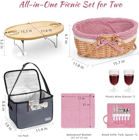 - Versatile Wicker Picnic Baskets for Every Occasion: Crafted from high-quality, durable wicker, this picnic basket set offers long-lasting use with a sturdy, secure handle for easy carrying. The charming red and white lining is removable and easy to clean. Perfect for picnics, beach trips, or weekend getaways, it also doubles as stylish home decor. Use it as a sewing bag, flower basket, dorothy basket, little red riding hood basket, or Easter basket, and fill it with farm-fresh jam for Christmas gifts or as a thoughtful wedding present. Its versatility makes it ideal for any occasion