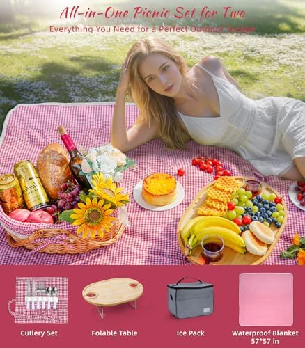 - This Red Picnic Set for 2 is designed to make every outdoor moment special. It includes 2 silver spoons and knives, 2 plastic wine glasses, and 1 waterproof blanket for cozy comfort. The lid transforms into a small table with cup holders, while the separate insulated cooler bag keeps your food fresh and ready. Crafted from high-quality, durable materials, this picnic set is ideal for couples seeking spontaneous picnics, weekend escapes, or intimate honeymoons