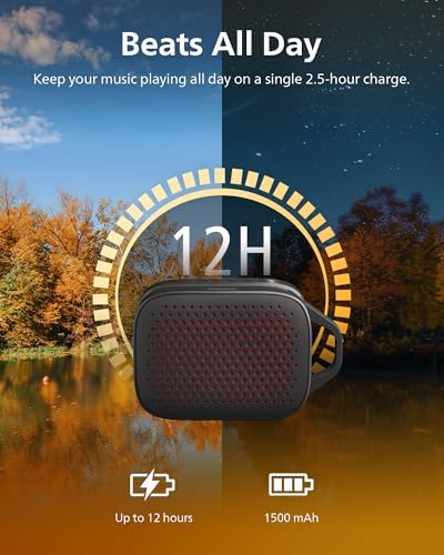 - PARTY ALL DAY: This reliable little speaker won't let you down when you need it. Fully charge with the included USB-C cable for up to 12 hours of continuous play time. The handy carry strap design means you can take this portable Bluetooth speaker anywhere.