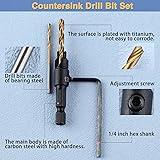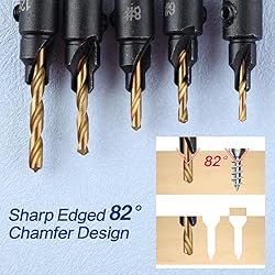【WHAT YOU GET】A five piece countersink drill set including #5(5/64"), #6(3/32"), #8(7/64"), #10(1/8"), #12(9/64") comes with 5 pieces of replaceable drill bits as a bonus and covers the full range of screw sizes. These sizes cater to the needs of cabinet and furniture makers, as well as other woodworking enthusiasts. 【APPLICATION】The countersink drill bits are ideal for bench drill, hand drill, and a conventional electric drill, perfect for wood, fiberboard, particleboard, plywood, plastic, PVC, rubber, etc. 【DESIGN】82-degree chamfer design Counter sink bits built with 1/4" Hex Shanks with groove for quick size changes without bit slipping, compatible with most electric drills and tools. An adjustable counter sleeve depth can be easily adjusted with the provided Allen wrench,enables flush screw heads or deeper holes to be covered with matching plugs for professional finish. 【MATERIAL】The main body is made of carbon steel with high hardness for superb cutting power, high durability and good wear resistance, and the drill bit is made of bearing steel with titanium-plated surface for more durability and less corrosion. 【EASY TO USE】3 in1 countersink drill bit set ,enable you to drill, countersink and counterbore in one step.This can make perfect countersink holes for both flush-set and plugged screws, without splitting the wood and enjoying neat projects with drill bit sets.