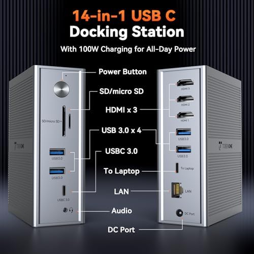 - Ultimate Connectivity Solution- Specifically crafted for professionals, this docking station dual hdmi is a laptop/PC multi-screen expander with 14 versatile ports. It seamlessly facilitates 3 Monitor extended display, even when paired with MacBook models equipped with M1/M2/M3/M4/M5 chips, empowering you to effortlessly manage work across three monitors. What's more, it provides a robust 100W charging capacity, ensuring your devices stay charged and ready all day long.
