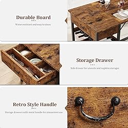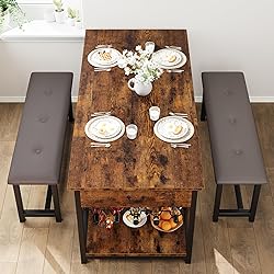 Comfortable & Durable Upholstered Bench: This dining table set features a bench constructed from MDF board and a metal frame, equipped with high-elastic cushions covered in PU leather. We utilize a heavy-duty steel structure with a larger diameter to ensure strength and durability, providing a longer lifespan compared to other options. The upgraded design of the dining table bench includes a fully upholstered finish, enhancing your dining experience with added comfort Space-Saving Dining Table Set for 4: This grey dining table comes with a table measuring 59.06"L x 27.56"W x 29.53"H and two benches sized 40.94"L x 11.81"W x 18.11"H. The benches can conveniently tuck under the table to save space, making this set perfect for compact living areas such as kitchens, studios, and apartments Unique Dining Table with Storage Design: Our kitchen table incorporates a storage drawer and a wine rack on one side. The drawer features four compartments for organizing napkins, utensils, and colanders. Additionally, we have included a flip-top design in the traditional pull-out drawer for easier access to tableware. The two-tier wine rack holds five bottles of red wine on top while accommodating beers and other beverages below Easy to Assemble and Maintain Kitchen Table Set: This dining table set includes clear and straightforward installation instructions, ensuring effortless assembly. The tabletop has a waterproof and anti-corrosion coating, allowing you to simply wipe it down with a damp cloth to maintain its clean surface High-Quality 3-Piece Dining Table Set: Our rectangular dining table features a retro-style design along with two upholstered benches. The tabletop is crafted from high-quality MDF with a grey grain finish, promoting a calm and elegant dining atmosphere. The thicker metal frame enhances the overall sturdiness of the dining set. In addition, the long dining bench, featuring high-elastic cushions wrapped in PU leather and built from heavy-duty steel, guarantees a comfortable dining experience
