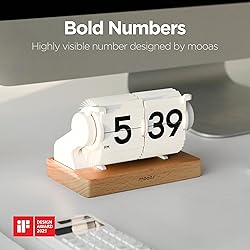 - Mooas Flip Desk Clock A classical interior clock with the number pad flips over as time passes! Material: Metal, PVC Size: 8.27 x 3.9 x 6.3inch (WxDxH) Weight: 375g Power: D type battery x 1ea (not included) Time difference range: ±90 seconds/month
