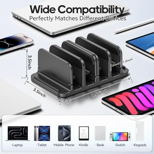 • Multifunctional 6 In 1 Design - The newly upgraded laptop stand has six storage slots for storing and organizing up to six devices at once. The vertical laptop stand slots are carefully designed to securely hold laptops, tablets, cell phones, Kindle, books, game consoles and more, making it an efficient multi-device organizer that saves you space on your desktop.