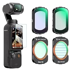 4 Pack Effect Filters Kit: K&F CONCEPT 4-Pack Effect Filters Kit for DJI Osmo Pocket 3 - Includes Black Diffusion 1/4, Blue Streak, Light Pollution Reduction, Star Light Lens Filters , made of HD optical glass, adopt dual-side multi-coated, features magnetic attach, no effect on camera gimbal, help achive cinematic film effect for creators. Create Cinematic Effect: This black diffusion 1/4 filter for Osmo Pocket 3 is great for portraits, lighting, night photography, it's a nice tool to create mist film effect, it help soft highlight flares and keep the dark detail, could soften facial skin's wrinkles, freckles, and pores, making it more delicate, plump, and gorgeous Osmo Pocket 3 Star Filter: Helps creates a starburst effect from point light sources within an image, ideal for shooting night scenes, jewelry, water, starlight, Light, wedding photography, product advertising photography and more, which can produce a radiant effect in the highlights of the scene being photographed, making the photo more artistic and visually impactful. Light Pollution Reduction Filter for Osmo Pocket 3: Helps to reduce the unwanted effect of yellow/green color caused by city lights, giving photographs more contrast and clarity as a result. Realize Anamorphic Flare Effect: The blue streak filter from K&F CONCEPT is specially designed for DJI Osmo Pocket 3, helps add a cool cinematic effect on your photo and video image by turning bright light spots and specular highlights into linear anamorphic flares.