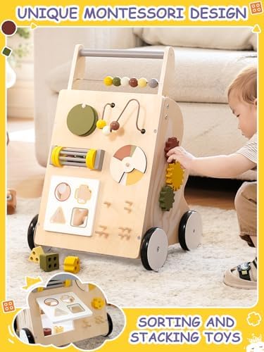 - MONTESSORI-INSPIRED LEARNING FUN: Features exclusive stacking and sorting toys on the infant walker to develop fine motor skills, hand-eye coordination, and problem-solving, boost cognitive growth, and support early development the Montessori way.