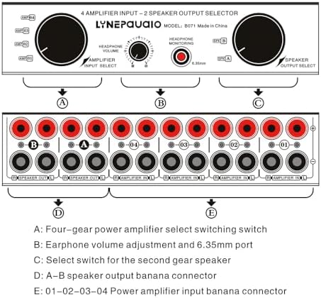 Specifications: Material: Metal iron shell Color: Black Input/Output: 4 sets of inputs/2 sets of outputs (banana plug) Channel Power: Each channel supports a maximum power of 300W. Product Weight: 850g/30oz Product Size: 24 * 9 * 5.5cm/9.4 * 3.5 * 2.2inch Note: Due to the different display screen and light effect, the actual color of the item might be slightly different from the color showed on the pictures. Packing List: 1 x Power Amplifier Speaker Select Switcher packing list: 1 x Power Amplifier Speaker Select Switcher
