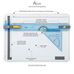 - Introducing the Acurit Technical Drawing Board, the quintessential tool for professionals and hobbyists in the field of architecture and engineering. This tabletop drafting table offers a seamless blend of functionality and durability. Crafted from lightweight, break-resistant plastic, this drawing board provides a reliable surface for all your creative endeavors. Measuring 14.5" x 19.75", with a working area of 12" x 16", the Acurit Technical Drawing Board is compact yet spacious enough to accommodate a range of drafting projects. The drafting board features an efficient multi-tool work surface, complete with a straight-edge equipped with a stop-and-go locking mechanism. This allows for precise adjustments and the creation of parallel lines, enhancing your drafting experience. The transparent ruler, marked with inches and an inking edge, is complemented by push-button locks that ensure stability during use. The clamping rail is a notable feature, securely holding paper in place and allowing you to focus on the intricacies of your design. Additionally, this portable drafting table includes an assortment of drafting tools such as a protractor and a scholar triangle, making it an all-encompassing drafting kit. The board foot ruler included in the set is an indispensable tool for precise measurements. This architect drafting set is enhanced by its parallel drafting bars and engineering drafting set, making it an essential component of any architectural drafting table. Discover the convenience of a desktop drafting board that offers a drafting surface designed to bring your most intricate designs to life.