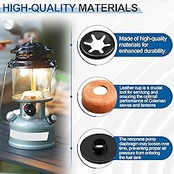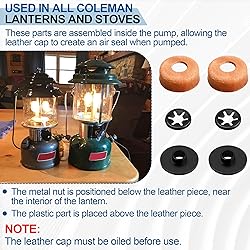 Compatible Replacement for Coleman Lanterns & Stoves: Keep your camping equipment in top condition with this pump cup replacement kit, designed for Coleman lanterns and stoves. Compatible with multiple models, including 222, 226, 229, 400, 440, 442, 445, 450, 550, 3022, and 3024. Complete Kit for Air Seal: The kit includes 2 leather pump caps, 2 metal nuts, and 2 plastic caps, working together to create a reliable airtight seal for efficient pumping and consistent performance. Durable and Long-Lasting Materials: Made from high-quality leather and durable components, these replacement parts meet OEM standards and are rigorously tested to ensure compatibility with Coleman lanterns and stoves. Easy Installation: The replacement pump cup kit is simple to install, taking only a few minutes to restore your lantern or stove's performance. An excellent alternative to purchasing a new unit, saving you both time and money. Satisfaction Guaranteed: We stand by the quality of our products. If you're not satisfied or have questions about the product, our professional support team is here to assist and ensure your complete satisfaction.