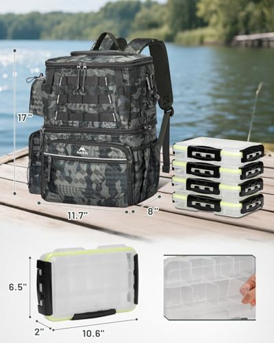 - Cooler Compartment with 4 Tackle Boxes Included: Fishing backpack with tackle box has a large insulated cooler compartment with four 3600 size trays included. You can open the cooler compartment 180 degrees easily and access tackle boxes quickly through the double zipper rope. Benefit from aluminum insulation material, you can store four pack 3600 tackle boxes or keep food and fruits warm/cold/fresh to replenish energy while fishing