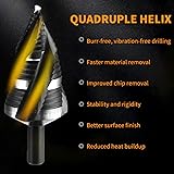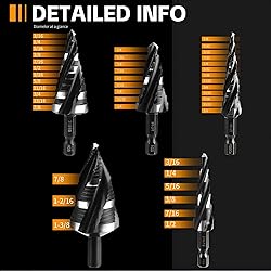 【5Pcs Drill Bits Kit】Our drill bit kit includes 5 drill bits. The set comprises step bits with diameters of 3/16"-1/2" (6 steps), 1/8"-1/2" (13 steps), 1/4"-3/4" (9 steps), 3/16"-7/8" (12 steps), and 3/16"-1-3/8" (19 steps). This comprehensive kit is the solution for all your drilling needs. 【Enhanced Durability】Our industrial-grade step drill set is made of robust high-speed steel with a titanium coating; Each step drill bit ensures strength. Each drill bit is carefully inspected at the factory to ensure quality and longevity. 【Drilling Made Easy】Four-slot step drill bit provides stability, improving accuracy and cutting speed. Miofth's step drill bit set ensures quick and smooth drilling through steel, aluminum, copper, wood, plastic, and other tough materials. 【Smooth & Clean Drilling】Designed with a four-spiral flute, this step bit set enables faster cutting and drilling compared to dual or single-flute bits. It improves accuracy and cutting speed, is suitable for various occasions, and can quickly and smoothly drill holes of different diameters. It also efficiently clears away chips for smooth performance. 【Compact & Portable】All these bits come in a sturdy blow-molded case, keeping them accessible for both home and on-the-go projects. Stay organized and ready for action anytime, anywhere. It's an essential addition to any DIY enthusiast's toolbox and can be utilized for multiple household projects.