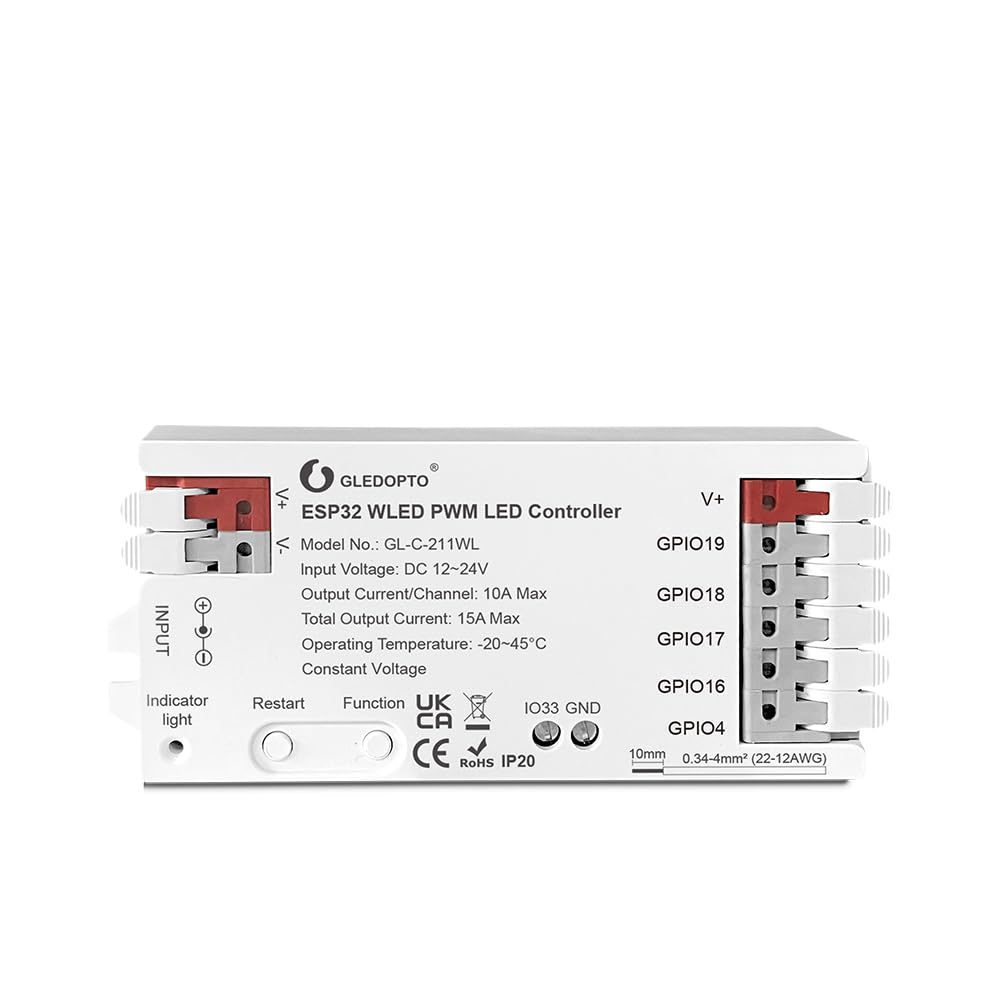 ESP32 WLED LED Strip Light Controller 15A Fuse Mic DIY Dynamic Lighting UART USB-C Download Energy Saving Relay App Control for RGB IC Addressable Digital WS2811 WS2812 SK6812 TM1814 WS2813 WS2815