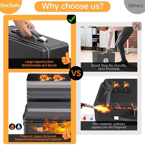- 6400°F Fireproof Resistant Insulation Protection: DocSafe 6400°F fireproof document box is made of 15mm premium fire-retardant, non-itchy silicone-coated fiberglass, thickened fireproof aluminum foil and hard-shell material which can stands up against fire and passed the UL classified and SGS TEST (UL-94 VTM-0 Burning Test). The multi-layer material protection of the fireproof safe box can withstand temperatures of up to 6400℉, completely protecting documents from fire damage