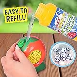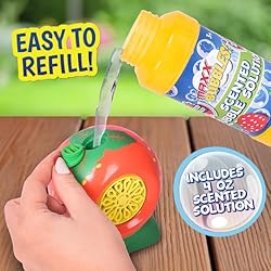COMPACT & PORTABLE: At 4.4 inches tall, the mini bubble machine is easy to carry and perfect for on-the-go fun – backyard, pool, beach, park or just a sunny afternoon CONSTANT BUBBLES: Just press the button to set off a steady stream of bubbles. It keeps making bubbles until you switch it off, ensuring non stop fun for everyone! SCENTED SOLUTION INCLUDED: Comes with 4 ounces of non-toxic bubble solution that matches the scent of the bubble machine. Fill the air with fruity scents while bubbles magically float around! DURABLE & SAFE: Made from sturdy, non-toxic, child-safe materials, ensuring hours of play. Requires 3 ‘AA’ batteries, not included. Ages 3 and up. ASSORTED STYLES, RECEIVE ONE: Available in four fruity styles - pineapple, strawberry, orange, and watermelon. Colors and styles received will vary upon ordering.