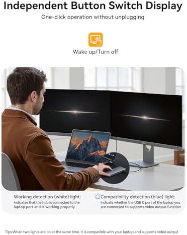 - Screen Switch Button + Screen Compatibility Detection Tip Light (Newly Upgraded): The dell docking station is equipped with a Screen Switch Adjustment Button, which can quickly turn off or wake up your display, say goodbye to the traditional hub in order to avoid power consumption and need to be re-plugged each time, a key to turn off and on, saving power consumption. The usb c dongle is also equipped with two prompt lights, work detection light and screen detection light: with ABIWAZY usb c hub, you only need to observe the prompt light, the prompt light is on: proving that the hdmi hub is working properly and that your USB C port supports the video output function and is compatible.