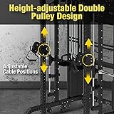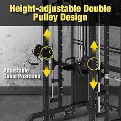All in One Smith Machine - Full Body Workout: This smith machine can meet all your needs in home gym. It is combined with power cage, smith machine, cable crossover machine, cable station, and pull-up station. It's your all-in-one solution for a complete body workout, targeting shoulders, back, chest, abs, arms, glutes, and legs. Train any muscle group you desire with ease and convenience. You can train your full-body with just one device 400LBS Weight Stacks: Achieve your strength goals with the impressive 400LBS weight stacks (200LBS per side), providing a range of resistance to match your fitness level. Each piece is 10 pounds, the weight is sufficient and uniform, allows for quick and accurate weight adjustments Versatile Multi-Grip & Reversible Pull-Up Bars: The pull-up bar is adjustable and reversible with 4 different positions and angled for both wide and narrow grip pull-ups Smooth & Precise Pulley System: The Smith Machine features a high-quality pulley system with dual 200lb weight stacks and a 2:1 pulley ratio, reducing strain while maximizing resistance. With adjustable positions, the cable system offers smooth motion and extended travel, ensuring a seamless experience for exercises like bicep curls, triceps pushdowns, chest presses, and more Versatile Training for All Levels: Designed for everyone from beginners to professional athletes, the Smith machine ensures safety and efficiency in strength training, whether for building muscle, injury recovery, or overall fitness improvement